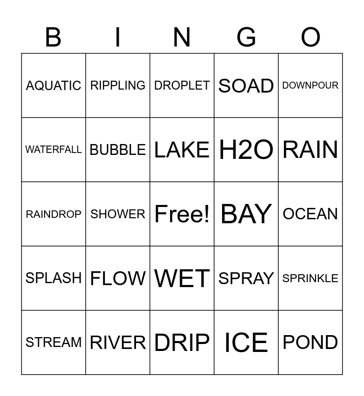 This bingo card has a free space and 24 words: FLOW, RIVER, LAKE, STREAM, DOWNPOUR, AQUATIC, WATERFALL, RIPPLING, BAY, WET, H2O, RAINDROP, SPRAY, SPRINKLE, BUBBLE, ICE, OCEAN, DROPLET, RAIN, SHOWER, POND, SPLASH, SOAD and DRIP.