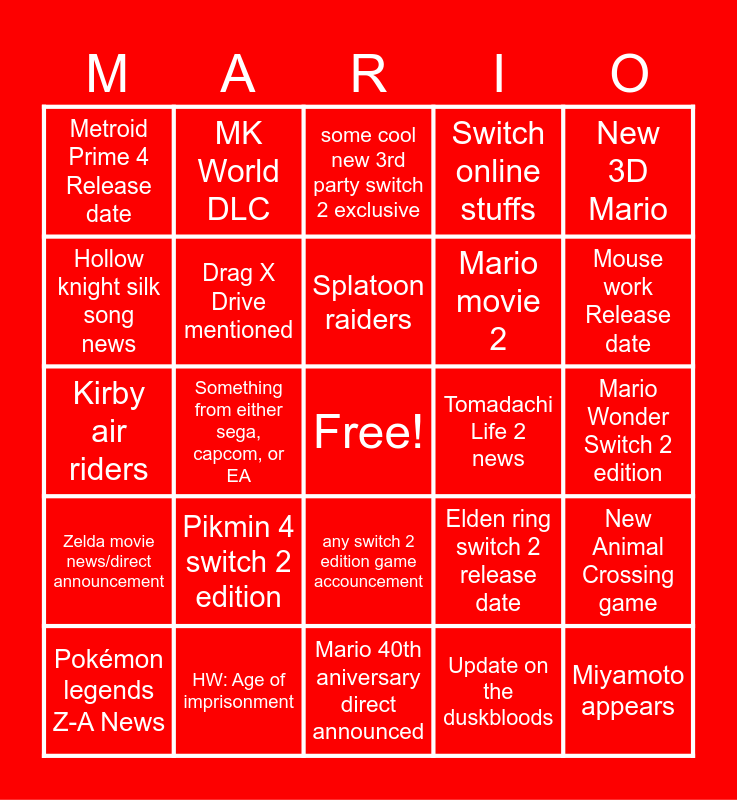 This bingo card has a free space and 24 words: Pikmin 4 switch 2 edition, HW: Age of imprisonment, Splatoon raiders, Pokémon legends Z-A News, New 3D Mario, Metroid Prime 4 Release date, Hollow knight silk song news, MK World DLC, Tomadachi Life 2 news, any switch 2 edition game accouncement, Mario movie 2, Kirby air riders, Elden ring switch 2 release date, New Animal Crossing game, Drag X Drive mentioned, Update on the duskbloods, Mario Wonder Switch 2 edition, some cool new 3rd party switch 2 exclusive, Mouse work Release date, Something from either sega, capcom, or EA, Miyamoto appears, Zelda movie news/direct announcement, Switch online stuffs and Mario 40th aniversary direct announced.