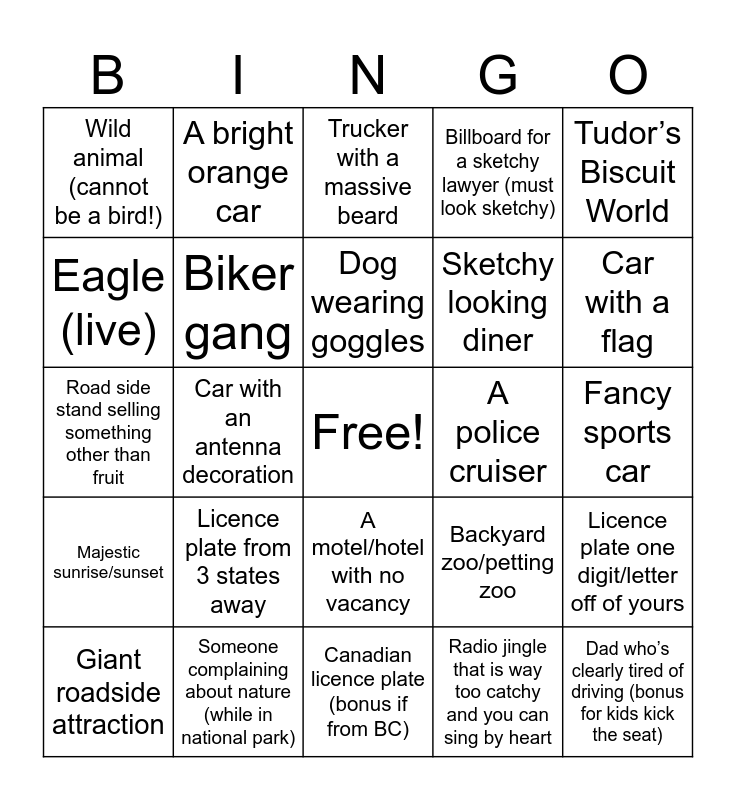 This bingo card has a free space and 25 words: Licence plate from 3 states away, Canadian licence plate (bonus if from BC), Dog wearing goggles, Giant roadside attraction, Tudor’s Biscuit World, Wild animal (cannot be a bird!), Eagle (live), A bright orange car, A police cruiser, A motel/hotel with no vacancy, Sketchy looking diner, Road side stand selling something other than fruit, Backyard zoo/petting zoo, Licence plate one digit/letter off of yours, Biker gang, Car with a funny bumper sticker (not political), Fancy sports car, Trucker with a massive beard, Car with a flag, Car with an antenna decoration, Dad who’s clearly tired of driving (bonus for kids kick the seat), Someone complaining about nature (while in national park), Majestic sunrise/sunset, Billboard for a sketchy lawyer (must look sketchy) and Radio jingle that is way too catchy and you can sing by heart.