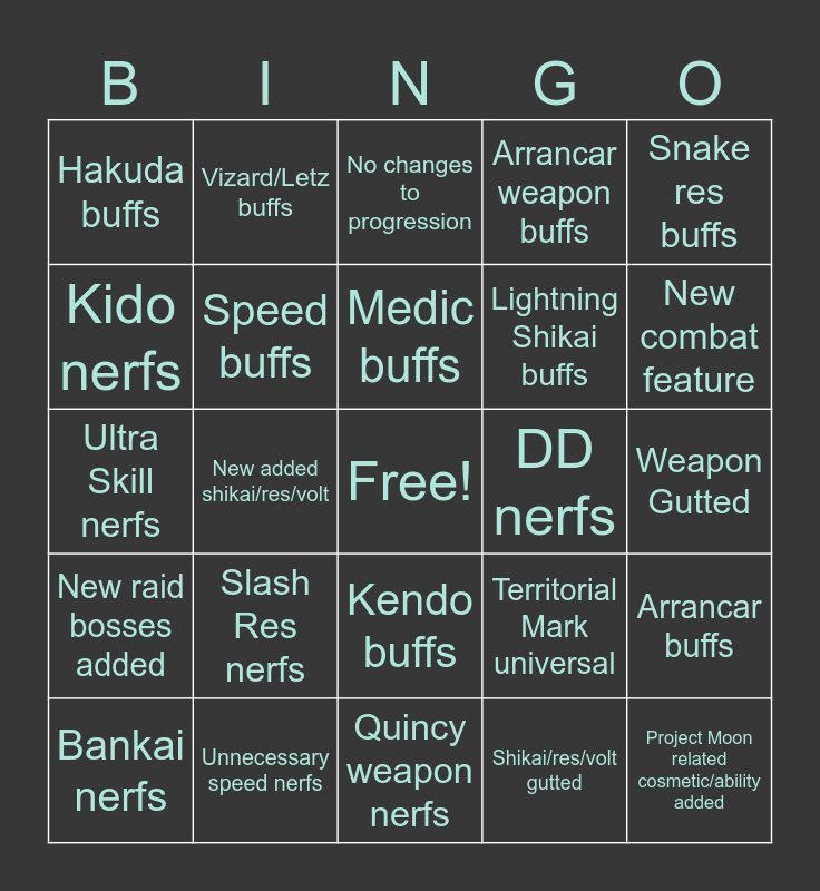 This bingo card has a free space and 24 words: Slash Res nerfs, Unnecessary speed nerfs, Medic buffs, Bankai nerfs, Snake res buffs, Hakuda buffs, Kido nerfs, Vizard/Letz buffs, DD nerfs, Kendo buffs, Lightning Shikai buffs, Ultra Skill nerfs, Territorial Mark universal, Arrancar buffs, Speed buffs, Shikai/res/volt gutted, Weapon Gutted, No changes to progression, New combat feature, New added shikai/res/volt, Project Moon related cosmetic/ability added, New raid bosses added, Arrancar weapon buffs and Quincy weapon nerfs.