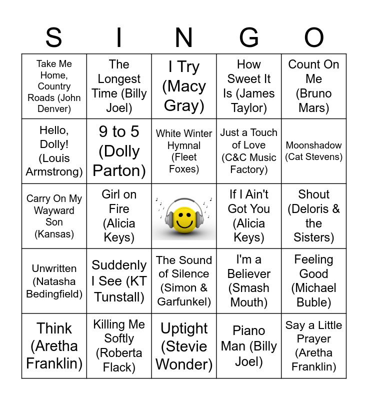 This bingo card has a free space and 24 words: Suddenly I See (KT Tunstall), Killing Me Softly (Roberta Flack), White Winter Hymnal (Fleet Foxes), Think (Aretha Franklin), Count On Me (Bruno Mars), Take Me Home, Country Roads (John Denver), Hello, Dolly! (Louis Armstrong), The Longest Time (Billy Joel), If I Ain't Got You (Alicia Keys), The Sound of Silence (Simon & Garfunkel), Just a Touch of Love (C&C Music Factory), Carry On My Wayward Son (Kansas), I'm a Believer (Smash Mouth), Feeling Good (Michael Buble), 9 to 5 (Dolly Parton), Piano Man (Billy Joel), Shout (Deloris & the Sisters), I Try (Macy Gray), Moonshadow (Cat Stevens), Girl on Fire (Alicia Keys), Say a Little Prayer (Aretha Franklin), Unwritten (Natasha Bedingfield), How Sweet It Is (James Taylor) and Uptight (Stevie Wonder).