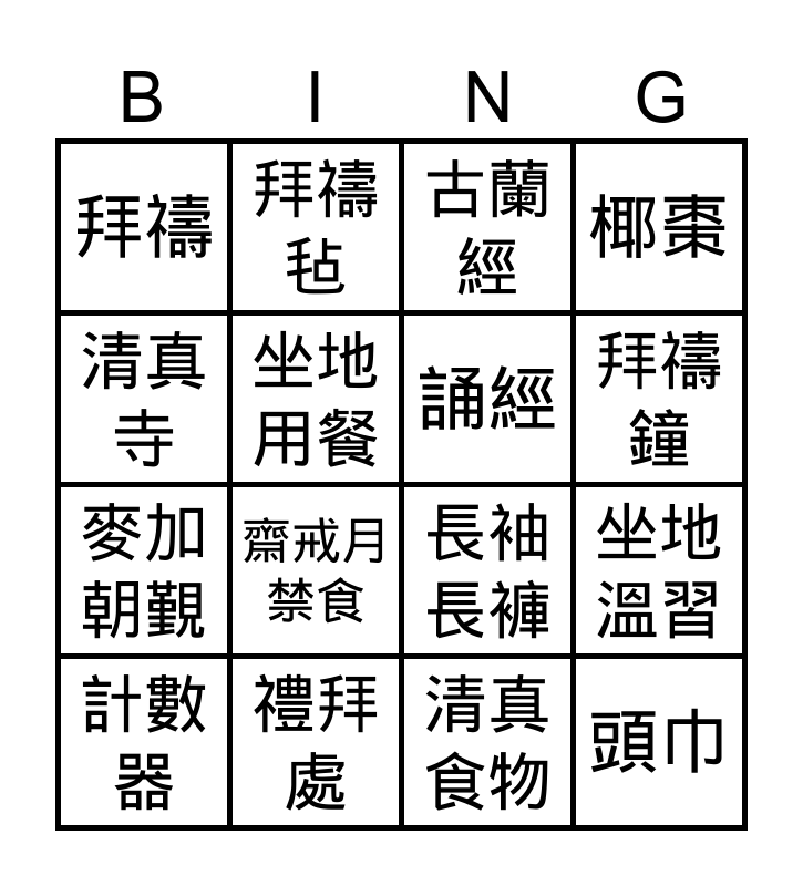 This bingo card has 20 words: 坐地溫習, 禁飲酒, 古蘭經, 手抓食物, 計數器, 清真寺, 禮拜處, 拜禱, 麥加朝覲, 拜禱毡, 齋戒月禁食, 長袖長褲, 坐地用餐, 頭巾, 誦經, 新月+星, 拜禱鐘, 椰棗, 清真食物 and 禁食豬肉.