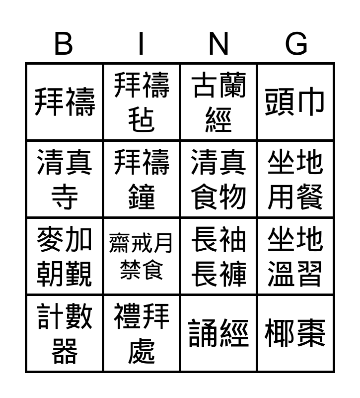 This bingo card has 20 words: 坐地溫習, 禁飲酒, 古蘭經, 手抓食物, 計數器, 清真寺, 禮拜處, 拜禱, 麥加朝覲, 拜禱毡, 齋戒月禁食, 長袖長褲, 拜禱鐘, 椰棗, 清真食物, 禁食豬肉, 坐地用餐, 頭巾, 誦經 and 新月+星.