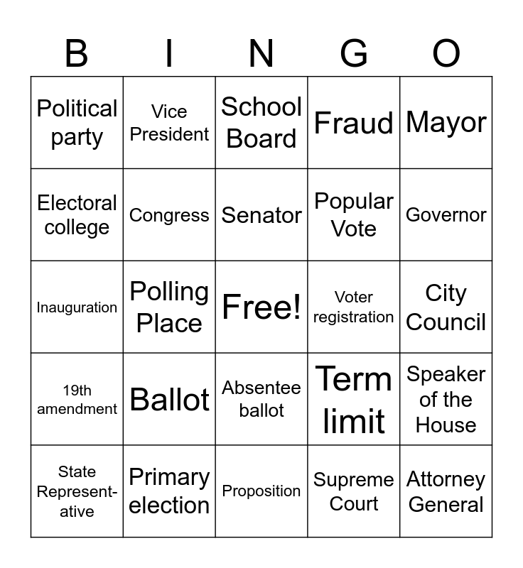 This bingo card has a free space and 24 words: Ballot, Primary election, Senator, State Represent-ative, Mayor, Political party, Electoral college, Vice President, Voter registration, Absentee ballot, Popular Vote, Inauguration, Term limit, Speaker of the House, Congress, Supreme Court, City Council, School Board, Governor, Polling Place, Attorney General, 19th amendment, Fraud and Proposition.