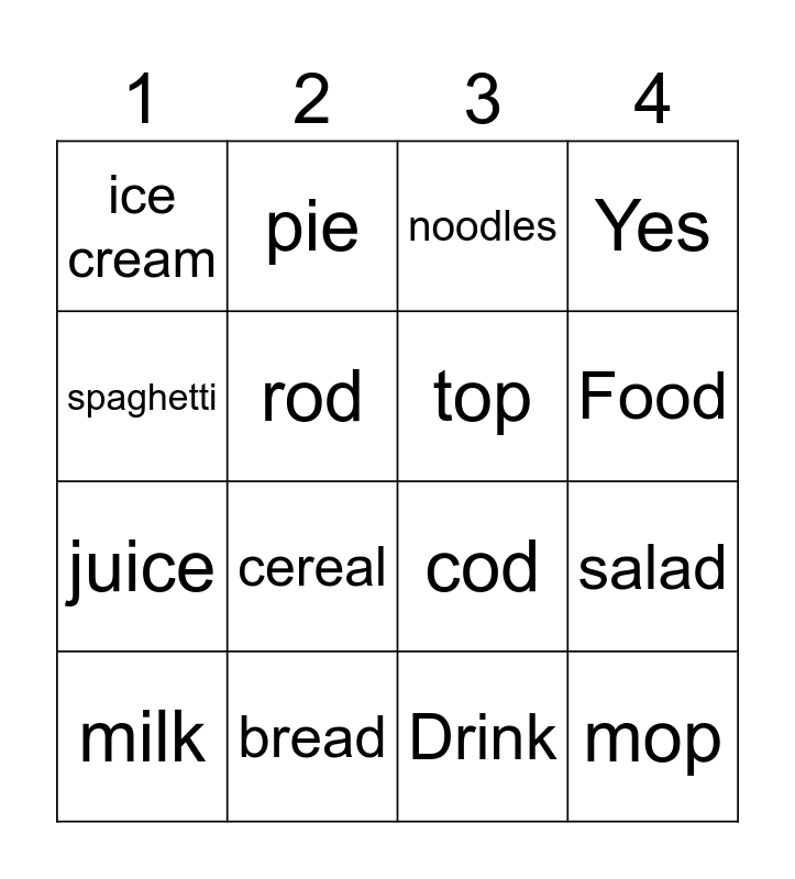 This bingo card has 20 words: salad, soup, noodles, yogurt, milk, spaghetti, bread, ice cream, juice, pie, cereal, cod, rod, mop, top, FREE!, Food, Yes, Drink and No.
