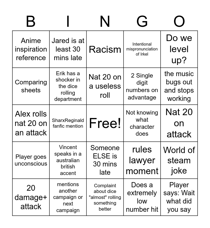 This bingo card has a free space and 24 words: 20 damage+ attack, Vincent speaks in a australian british accent, Nat 20 on a useless roll, Does a extremely low number hit, Do we level up?, Anime inspiration reference, Jared is at least 30 mins late, Racism, Not knowing what character does, Nat 20 on attack, Alex rolls nat 20 on an attack, Erik has a shocker in the dice rolling department, rules lawyer moment, World of steam joke, Comparing sheets, mentions another campaign or next campaign, Complaint about dice "almost" rolling something better, Intentional mispronunciation of Irkel, the music bugs out and stops working, Player goes unconscious, SharxReginald fanfic mention, Someone ELSE is 30 mins late, 2 Single digit numbers on advantage and Player says: Wait what did you say.