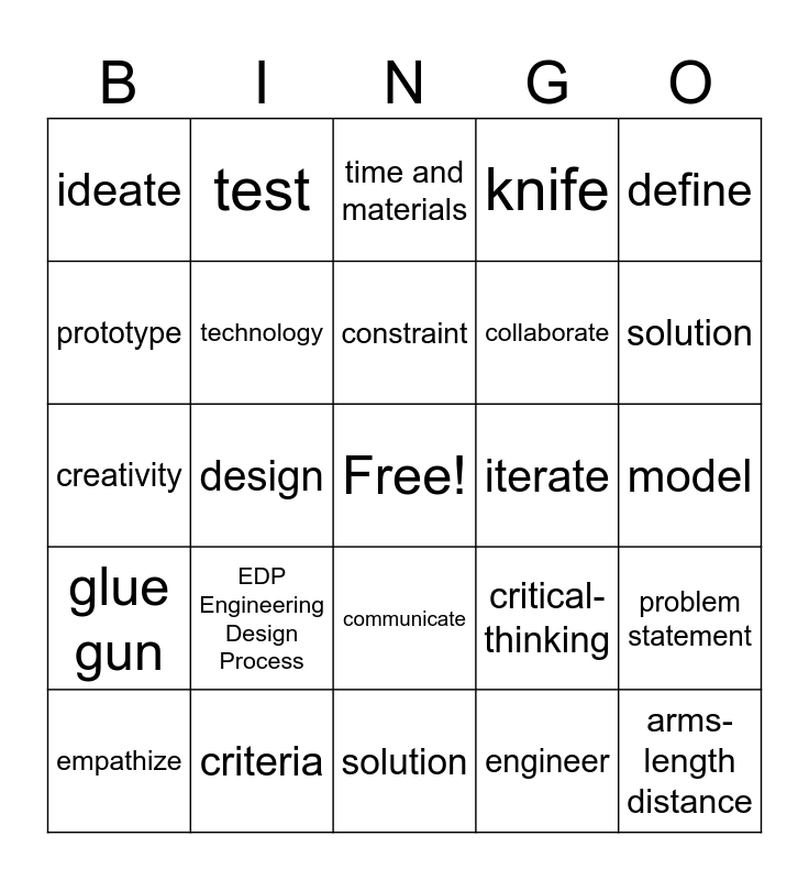 This bingo card has a free space and 24 words: EDP Engineering Design Process, criteria, constraint, empathize, define, ideate, prototype, test, iterate, communicate, collaborate, creativity, critical-thinking, problem statement, technology, engineer, model, time and materials, solution, design, arms-length distance, glue gun, knife and solution.