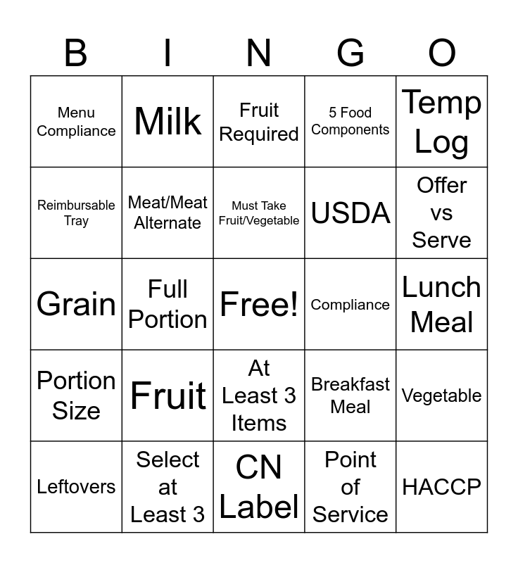 This bingo card has a free space and 24 words: Fruit, Select at Least 3, Must Take Fruit/Vegetable, Leftovers, Temp Log, Menu Compliance, Reimbursable Tray, Milk, Compliance, At Least 3 Items, USDA, Grain, Breakfast Meal, Vegetable, Meat/Meat Alternate, Point of Service, Lunch Meal, Fruit Required, Offer vs Serve, Full Portion, HACCP, Portion Size, 5 Food Components and CN Label.