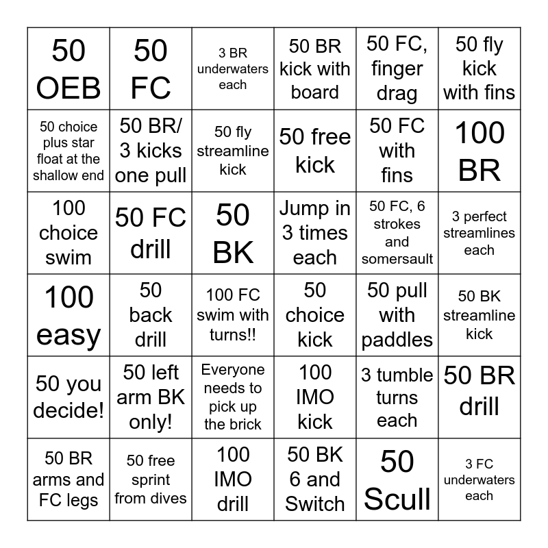 This bingo card has 36 words: 100 easy, 50 back drill, 100 IMO drill, 50 free kick, 50 FC, 6 strokes and somersault, 3 perfect streamlines each, 50 OEB, 50 free sprint from dives, 3 BR underwaters each, 100 IMO kick, 50 FC with fins, 50 fly kick with fins, 50 you decide!, 50 FC drill, 50 fly streamline kick, 50 BR kick with board, 3 tumble turns each, 50 BK streamline kick, 50 choice plus star float at the shallow end, 50 BR/ 3 kicks one pull, 100 FC swim with turns!!, 50 choice kick, 50 pull with paddles, 50 BR drill, 100 choice swim, 50 FC, 50 BK, 50 BK 6 and Switch, 50 FC, finger drag, 100 BR, 50 BR arms and FC legs, 50 left arm BK only!, Everyone needs to pick up the brick, Jump in 3 times each, 50 Scull and 3 FC underwaters each.
