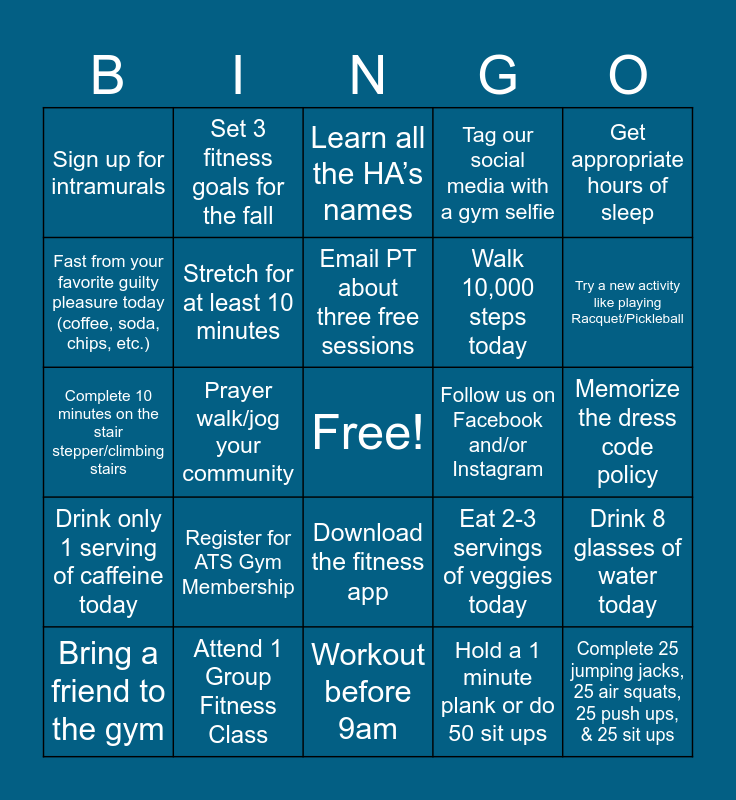 This bingo card has a free space and 24 words: Register for ATS Gym Membership, Attend 1 Group Fitness Class, Email PT about three free sessions, Bring a friend to the gym, Get appropriate hours of sleep, Sign up for intramurals, Fast from your favorite guilty pleasure today (coffee, soda, chips, etc.), Set 3 fitness goals for the fall, Follow us on Facebook and/or Instagram, Download the fitness app, Walk 10,000 steps today, Complete 10 minutes on the stair stepper/climbing stairs, Eat 2-3 servings of veggies today, Drink 8 glasses of water today, Stretch for at least 10 minutes, Hold a 1 minute plank or do 50 sit ups, Memorize the dress code policy, Learn all the HA’s names, Try a new activity like playing Racquet/Pickleball, Prayer walk/jog your community, Complete 25 jumping jacks, 25 air squats, 25 push ups, & 25 sit ups, Drink only 1 serving of caffeine today, Tag our social media with a gym selfie and Workout before 9am.