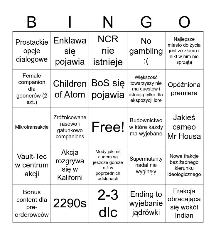 This bingo card has a free space and 24 words: Akcja rozgrywa się w Kaliforni, 2290s, BoS się pojawia, Bonus content dla pre-orderowców, Najlepsze miasto do życia jest ze złomu i nikt w nim nie sprząta, Prostackie opcje dialogowe, Female companion dla goonerów (2 szt.), Enklawa się pojawia, Budownictwo w które każdy ma wyjebane, Mody jakimś cudem są jeszcze gorsze niż w poprzednich odsłonach, Większość towarzyszy nie ma questów i istnieją tylko dla ekspozycji lore, Mikrotransakcje, Supermutanty nadal nie wyginęły, Nowe frakcje bez żadnego kierunku ideologicznego, Children of Atom, Ending to wyjebanie jądrówki, Jakieś cameo Mr Housa, NCR nie istnieje, Opóźniona premiera, Zróżnicowane rasowo i gatunkowo companions, Frakcja obracająca się wokół Indian, Vault-Tec w centrum akcji, No gambling :( and 2-3 dlc.