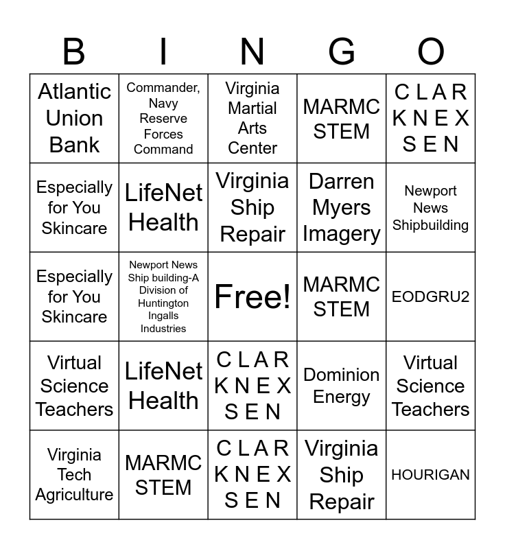This bingo card has a free space and 72 words: NASA Langley Research Center, Commander, Navy Reserve Forces Command, Newport News Ship building-A Division of Huntington Ingalls Industries, Virginia Tech Agriculture, ExtensionJunior Achievement, ODU AIAA, MARMC STEM, Eagle Aerial Images, Darren Myers Imagery, Virginia Martial Arts Center, Virginia Tech Agriculture, Virginia Ship Repair, Newport News Shipbuilding, Atlantic Union Bank, Virginia Natural Gas, Especially for You Skincare, Dominion Energy, C L A R K N E X S E N, Hampton Roads Workforce Council, EODGRU2, LifeNet Health, HOURIGAN, Virtual Science Teachers, NNSY, STEM Academy, NASA Langley Research Center, Newport News Ship building-A Division of Huntington Ingalls Industries, Virginia Tech Agriculture, ExtensionJunior Achievement, ODU AIAA, MARMC STEM, Eagle Aerial Images, Darren Myers Imagery, Virginia Martial Arts Center, Virginia Ship Repair, Newport News Shipbuilding, Atlantic Union Bank, Virginia Natural Gas, Especially for You Skincare, Dominion Energy, C L A R K N E X S E N, Hampton Roads Workforce Council, EODGRU2, LifeNet Health, HOURIGAN, Virtual Science Teachers, NNSY, STEM Academy, NASA, Newport News Ship building, Virginia Tech Agriculture, Extension Junior Achievement, ODU AIAA, MARMC STEM, Eagle Aerial Images, Darren Myers Imagery, Virginia Martial Arts Center, Virginia Ship Repair, Newport News Shipbuilding, Atlantic Union Bank, Virginia Natural Gas, Especially for You Skincare, Dominion Energy, C L A R K N E X S E N, Hampton Roads Workforce Council, EODGRU2, LifeNet Health, HOURIGAN, Virtual Science Teachers, NNSY, Governor’s STEM Academy and NIWC-Atlantic.