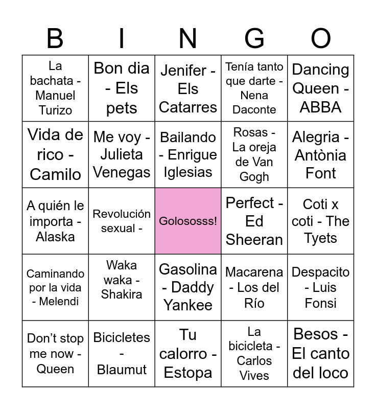 This bingo card has a free space and 24 words: Waka waka - Shakira, Bicicletes - Blaumut, Bailando - Enrigue Iglesias, Don’t stop me now - Queen, Dancing Queen - ABBA, La bachata - Manuel Turizo, Vida de rico - Camilo, Bon dia - Els pets, Perfect - Ed Sheeran, Gasolina - Daddy Yankee, Rosas - La oreja de Van Gogh, A quién le importa - Alaska, Macarena - Los del Río, Despacito - Luis Fonsi, Me voy - Julieta Venegas, La bicicleta - Carlos Vives, Coti x coti - The Tyets, Jenifer - Els Catarres, Alegria -Antònia Font, Revolución sexual -, Besos - El canto del loco, Caminando por la vida - Melendi, Tenía tanto que darte - Nena Daconte and Tu calorro - Estopa.