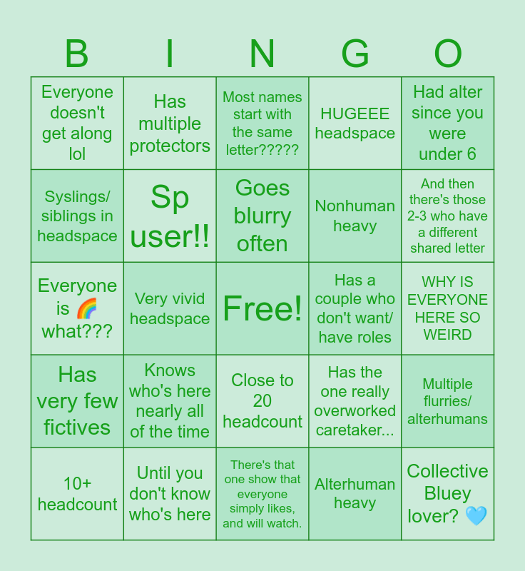 This bingo card has a free space and 24 words: Knows who's here nearly all of the time, Until you don't know who's here, Goes blurry often, 10+ headcount, Had alter since you were under 6, Everyone doesn't get along lol, Syslings/ siblings in headspace, Has multiple protectors, Has a couple who don't want/ have roles, Close to 20 headcount, Nonhuman heavy, Everyone is 🌈 what???, Has the one really overworked caretaker..., Multiple flurries/ alterhumans, Sp user!!, Alterhuman heavy, WHY IS EVERYONE HERE SO WEIRD, Most names start with the same letter?????, And then there's those 2-3 who have a different shared letter, Very vivid headspace, Collective Bluey lover? 🩵, Has very few fictives, HUGEEE headspace and There's that one show that everyone simply likes, and will watch..