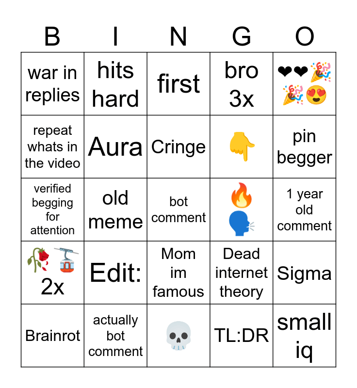 This bingo card has 25 words: Edit:, 💀, Cringe, Brainrot, ❤❤🎉🎉😍, war in replies, repeat whats in the video, hits hard, 🔥🗣, Mom im famous, 👇, verified begging for attention, Dead internet theory, Sigma, Aura, small iq, 1 year old comment, first, pin begger, old meme, bot comment, actually bot comment, 🥀🚡 2x, bro 3x and TL:DR.