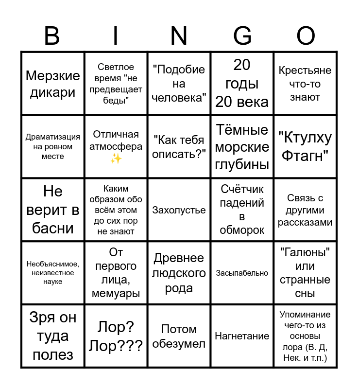 This bingo card has 25 words: От первого лица, мемуары, Потом обезумел, "Как тебя описать?", Зря он туда полез, Крестьяне что-то знают, Мерзкие дикари, Драматизация на ровном месте, Светлое время "не предвещает беды", Счётчик падений в обморок, Древнее людского рода, Тёмные морские глубины, Не верит в басни, Засыпабельно, "Галюны" или странные сны, Отличная атмосфера ✨, Упоминание чего-то из основы лора (В. Д, Нек. и т.п.), Связь с другими рассказами, "Подобие на человека", "Ктулху Фтагн", Каким образом обо всём этом до сих пор не знают, Захолустье, Лор? Лор???, Необъяснимое, неизвестное науке, 20 годы 20 века and Нагнетание.