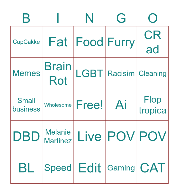 This bingo card has a free space and 35 words: Peaches, Art Fight, J*B, Brain Rot, Live, Furry, Memes, Rage bait, LGBT, Beastars, Small business, CR ad, Anime, Trisha, CupCakke, Ai, Gaming, Wholesome, DBD, CAT, POV, BL, POV, Speed, Food, Cleaning, Terri, NSFW, Racisim, Flop tropica, Cake, Edit, Melanie Martinez, Fat and Animal.