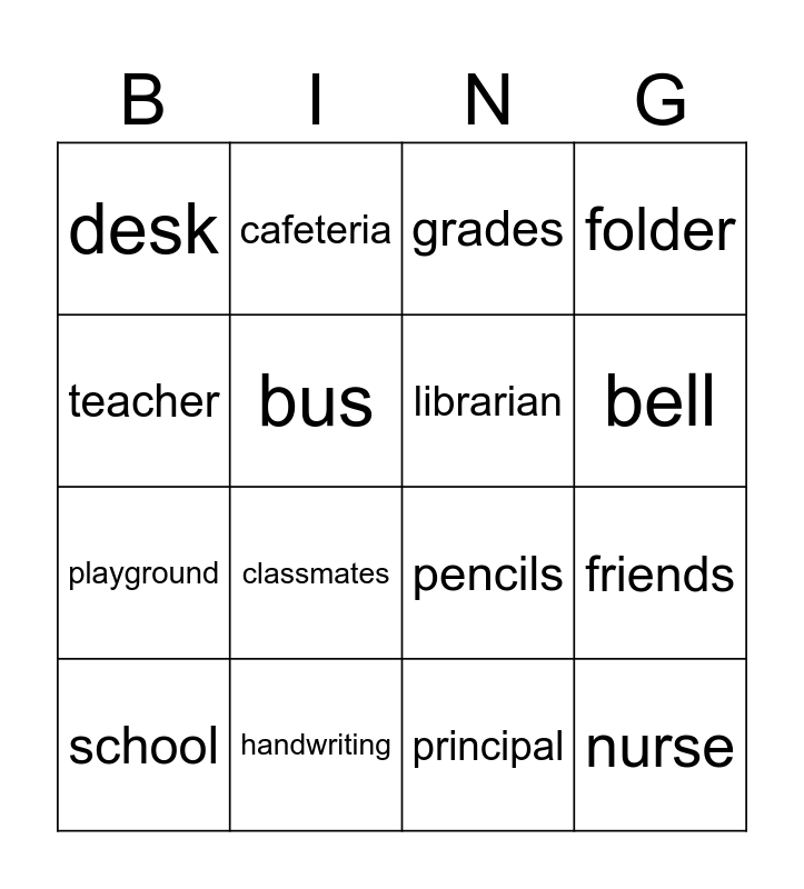 This bingo card has 26 words: Free!, backpack, bell, notebook, teacher, desk, bus, cafeteria, principal, library, playground, pencils, August, classes, friends, homework, folder, nurse, grades, school, classmates, playground, handwriting, routines, librarian and year.