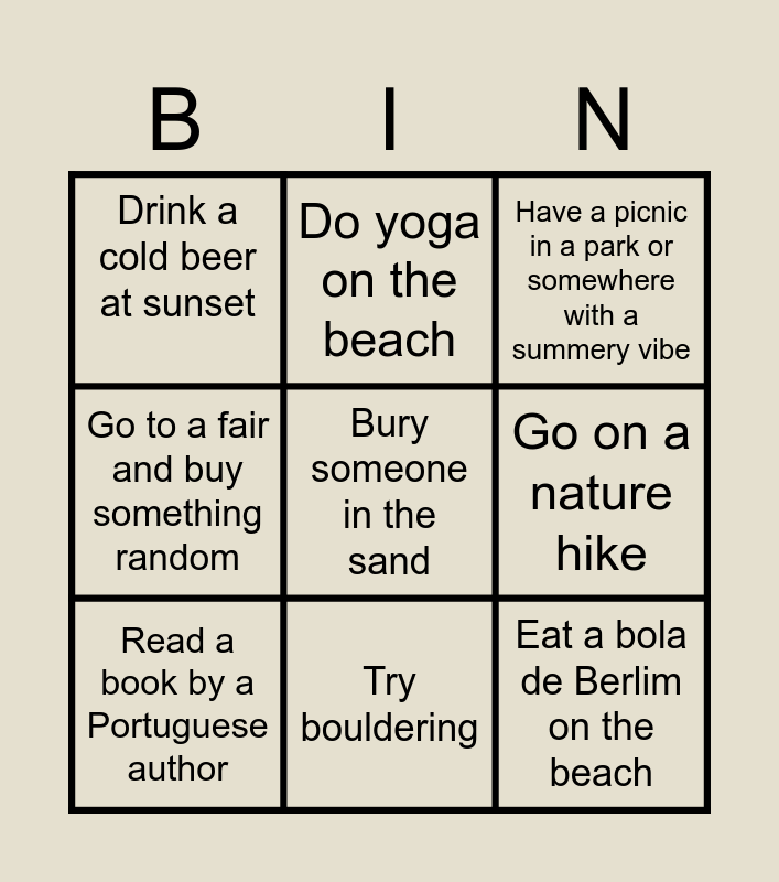 This bingo card has a free space and 8 words: Go on a nature hike, Have a picnic in a park or somewhere with a summery vibe, Do yoga on the beach, Read a book by a Portuguese author, Drink a cold beer at sunset, Eat a bola de Berlim on the beach, Go to a fair and buy something random and Try bouldering.
