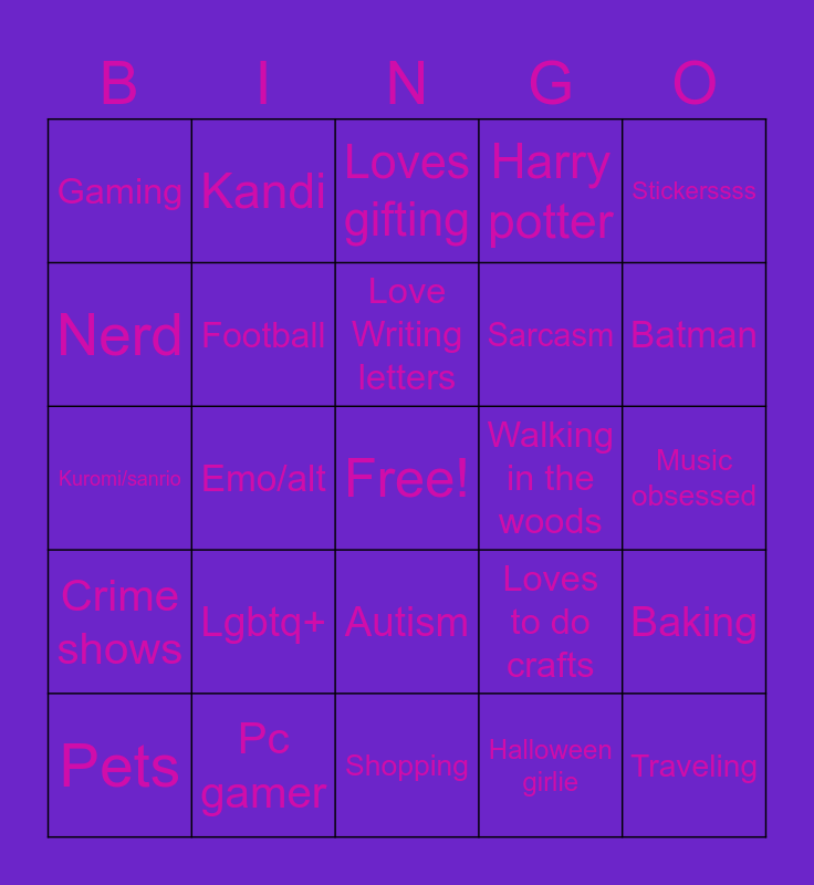 This bingo card has a free space and 24 words: Pets, Lgbtq+, Love Writing letters, Halloween girlie, Stickerssss, Gaming, Kandi, Loves gifting, Walking in the woods, Music obsessed, Kuromi/sanrio, Football, Loves to do crafts, Baking, Nerd, Pc gamer, Shopping, Harry potter, Batman, Crime shows, Emo/alt, Autism, Sarcasm and Traveling.