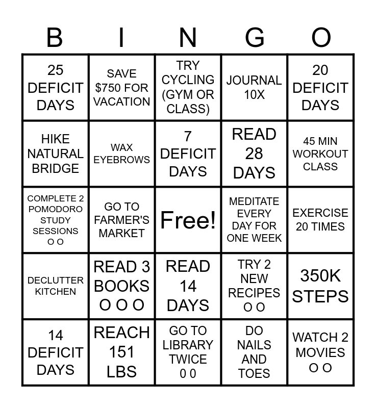 This bingo card has a free space and 24 words: READ 3 BOOKS O O O, REACH 151 LBS, 7 DEFICIT DAYS, 14 DEFICIT DAYS, 20 DEFICIT DAYS, 25 DEFICIT DAYS, HIKE NATURAL BRIDGE, SAVE $750 FOR VACATION, MEDITATE EVERY DAY FOR ONE WEEK, READ 14 DAYS, READ 28 DAYS, COMPLETE 2 POMODORO STUDY SESSIONS O O, TRY 2 NEW RECIPES O O, 350K STEPS, WAX EYEBROWS, DO NAILS AND TOES, EXERCISE 20 TIMES, TRY CYCLING (GYM OR CLASS), 45 MIN WORKOUT CLASS, GO TO FARMER'S MARKET, WATCH 2 MOVIES O O, DECLUTTER KITCHEN, JOURNAL 10X and GO TO LIBRARY TWICE 0 0.