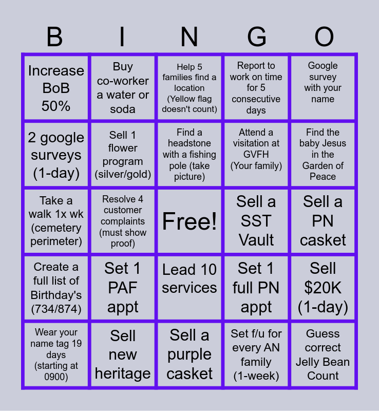This bingo card has a free space and 24 words: Set 1 PAF appt, Sell new heritage, Find a headstone with a fishing pole (take picture), Wear your name tag 19 days (starting at 0900), Google survey with your name, Increase BoB 50%, 2 google surveys (1-day), Buy co-worker a water or soda, Sell a SST Vault, Lead 10 services, Attend a visitation at GVFH (Your family), Take a walk 1x wk (cemetery perimeter), Set 1 full PN appt, Sell $20K (1-day), Sell 1 flower program (silver/gold), Set f/u for every AN family (1-week), Sell a PN casket, Help 5 families find a location (Yellow flag doesn't count), Find the baby Jesus in the Garden of Peace, Resolve 4 customer complaints (must show proof), Guess correct Jelly Bean Count, Create a full list of Birthday's (734/874), Report to work on time for 5 consecutive days and Sell a purple casket.