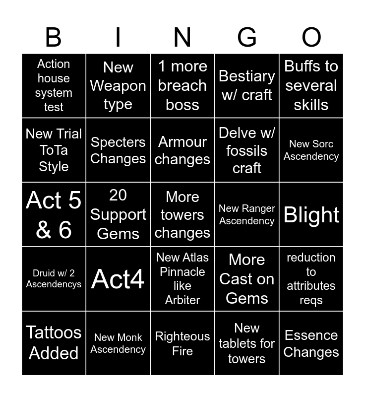 This bingo card has a free space and 24 words: Act4, New Monk Ascendency, Armour changes, Tattoos Added, Buffs to several skills, Action house system test, New Trial ToTa Style, New Weapon type, New Ranger Ascendency, New Atlas Pinnacle like Arbiter, Delve w/ fossils craft, Act 5 & 6, More Cast on Gems, reduction to attributes reqs, Specters Changes, New tablets for towers, Blight, 1 more breach boss, New Sorc Ascendency, 20 Support Gems, Essence Changes, Druid w/ 2 Ascendencys, Bestiary w/ craft and Righteous Fire.