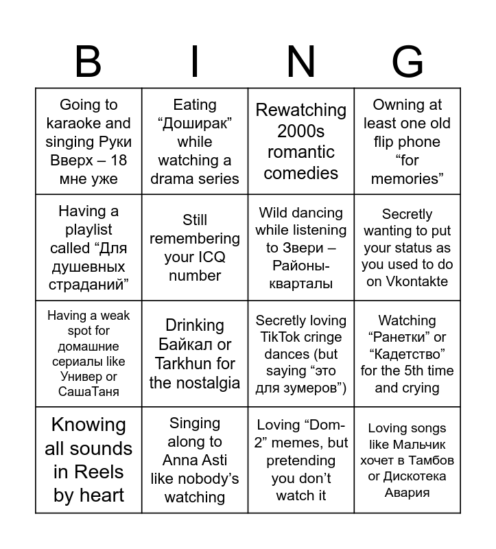 This bingo card has 16 words: Singing along to Anna Asti like nobody’s watching, Watching “Ранетки” or “Кадетство” for the 5th time and crying, Rewatching 2000s romantic comedies, Going to karaoke and singing Руки Вверх – 18 мне уже, Having a weak spot for домашние сериалы like Универ or СашаТаня, Eating “Доширак” while watching a drama series, Secretly loving TikTok cringe dances (but saying “это для зумеров”), Loving “Dom-2” memes, but pretending you don’t watch it, Having a playlist called “Для душевных страданий”, Still remembering your ICQ number, Knowing all sounds in Reels by heart, Owning at least one old flip phone “for memories”, Drinking Байкал or Tarkhun for the nostalgia, Secretly wanting to put your status as you used to do on Vkontakte, Wild dancing while listening to Звери – Районы-кварталы and Loving songs like Мальчик хочет в Тамбов or Дискотека Авария.