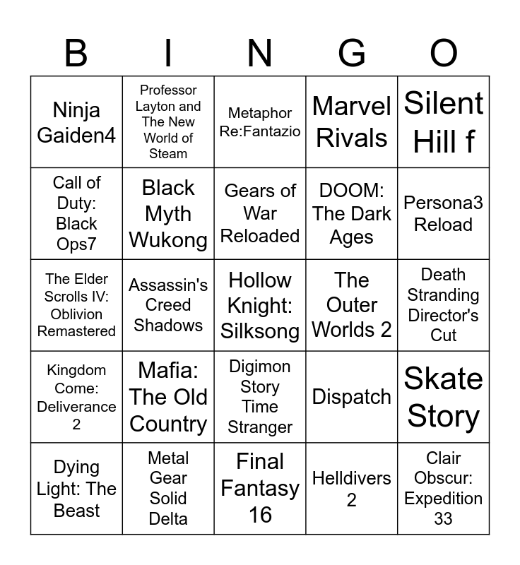 This bingo card has a free space and 24 words: Mafia: The Old Country, Metal Gear Solid Delta, Gears of War Reloaded, Dying Light: The Beast, Silent Hill f, Ninja Gaiden4, Call of Duty: Black Ops7, Professor Layton and The New World of Steam, The Outer Worlds 2, Digimon Story Time Stranger, DOOM: The Dark Ages, The Elder Scrolls IV: Oblivion Remastered, Dispatch, Skate Story, Black Myth Wukong, Helldivers 2, Death Stranding Director's Cut, Metaphor Re:Fantazio, Persona3 Reload, Assassin's Creed Shadows, Clair Obscur: Expedition 33, Kingdom Come: Deliverance 2, Marvel Rivals and Final Fantasy 16.