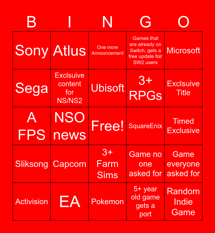 This bingo card has a free space and 24 words: Capcom, EA, Ubisoft, Activision, Microsoft, Sony, Sega, Atlus, SquareEnix, 3+ Farm Sims, 3+ RPGs, A FPS, Game no one asked for, Game everyone asked for, Exclsuive content for NS/NS2, 5+ year old game gets a port, Timed Exclusive, One more Announcement, Exclsuive Title, NSO news, Random Indie Game, Sliksong, Games that are already on Switch, gets a free update foir SW2 users and Pokemon.