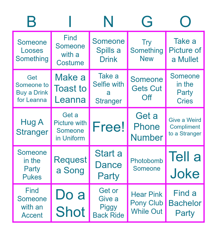 This bingo card has a free space and 24 words: Request a Song, Do a Shot, Take a Selfie with a Stranger, Find Someone with an Accent, Take a Picture of a Mullet, Someone Looses Something, Get Someone to Buy a Drink for Leanna, Find Someone with a Costume, Get a Phone Number, Start a Dance Party, Someone Gets Cut Off, Hug A Stranger, Photobomb Someone, Tell a Joke, Make a Toast to Leanna, Hear Pink Pony Club While Out, Give a Weird Compliment to a Stranger, Someone Spills a Drink, Someone in the Party Cries, Get a Picture with Someone in Uniform, Find a Bachelor Party, Someone in the Party Pukes, Try Something New and Get or Give a Piggy Back Ride.