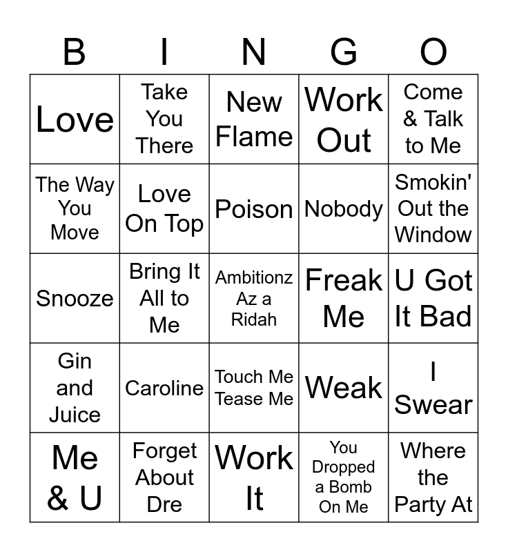 This bingo card has 38 words: I Just Called to Say I Love You, Bartender, Back & Forth, Love On Top, I Swear, Caroline, Poison, Hate It Or Love It, Come & Talk to Me, Nobody, Bring It All to Me, Work Out, Ambitionz Az a Ridah, U Got It Bad, The Way You Move, Gin and Juice, goosebumps, New Flame, Family Affair, Freak Me, Love, Forget About Dre, Smokin' Out the Window, Me & U, My Lovin' (You're Never Gonna Get It), Work It, Where the Party At, Brick House, Not Like Us, Touch My Body, Pyramids, Touch Me Tease Me, You Dropped a Bomb On Me, Take You There, Adorn, Weak, Snooze and Where My Girls At?.