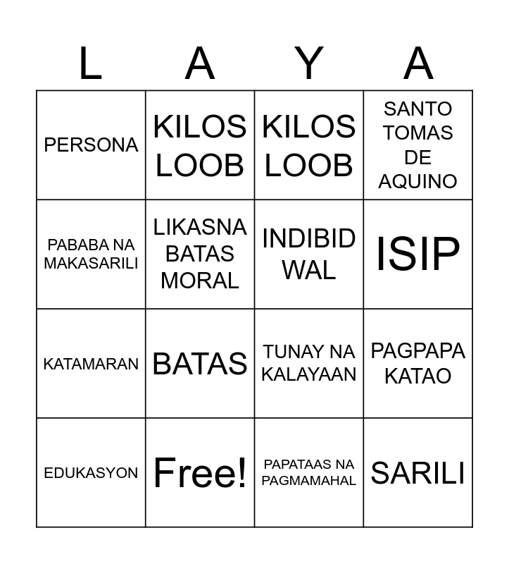 This bingo card has 24 words: KALAYAAN MULA SA, PERSONA LIDAD, ISIP, KONSENSYA, PABABA NA MAKASARILI, PERSONA, LIKASNA BATAS MORAL, KILOS LOOB, Free!, KALAYAAN PARA SA, KATAMARAN, TUNAY NA KALAYAAN, MALING KALAYAAN, KAGUSTUHAN, INDIBID WAL, PAPATAAS NA PAGMAMAHAL, PAPATAAS NA PAGMAMAHAL, KILOS LOOB, BATAS, PAGPAPA KATAO, EDUKASYON, SARILI, SANTO TOMAS DE AQUINO and REGINE VELASQUEZ.