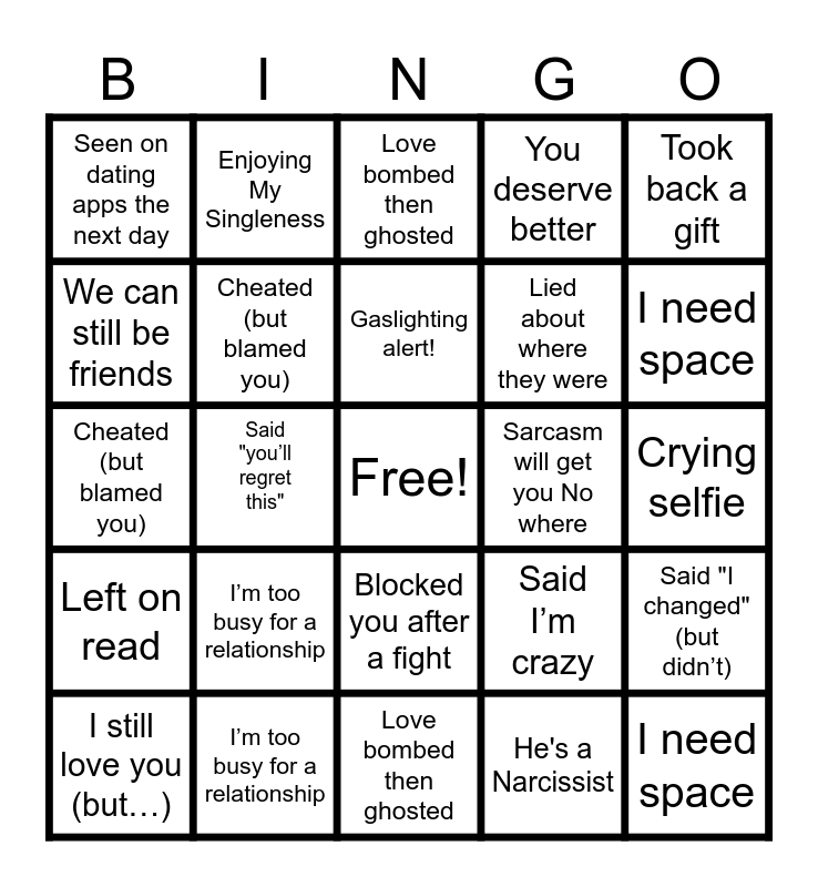 This bingo card has a free space and 48 words: My phone died, I need space, I still love you (but…), Love bombed then ghosted, I’m too busy for a relationship, Blocked you after a fight, Enjoying My Singleness, You’re overreacting, We can still be friends, It’s not you, it’s me It’s not you, it’s me, Cheated (but blamed you), You deserve better, Said "I changed" (but didn’t), Said I’m crazy, I forgot our anniversary, Got back with their ex, Gaslighting alert!, Sarcasm will get you No where, It’s just a friend, Took back a gift, Said "you’ll regret this", He's a Narcissist, Seen on dating apps the next day, Lied about where they were, It’s not you, it’s meIt’s not you, it’s me, I need space, I still love you (but…), We can still be friends, Blocked you after a fight, Left on read, Said "I changed" (but didn’t), You deserve better, I forgot our anniversary, Gaslighting alert!, I’m too busy for a relationship, My phone died, You’re overreacting, Crying selfie, Seen on dating apps the next day, Said I’m crazy, Took back a gift, It’s just a friend, Love bombed then ghosted, Got back with their ex, Cheated (but blamed you), Posted cryptic quotes, Lied about where they were and Said "you’ll regret this".
