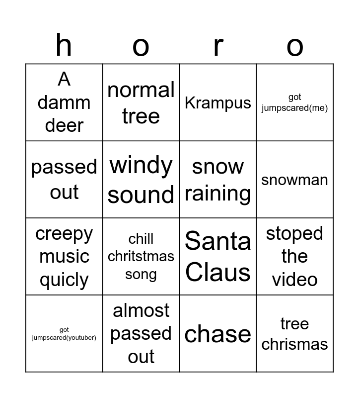 This bingo card has 18 words: chill chritstmas song, tree chrismas, Krampus, A damm deer, Santa Claus, got jumpscared(me), got jumpscared(youtuber), normal tree, snowman, creepy music quicly, chase, passed out, stoped the video, windy sound, snow raining, christmas LED, almost passed out and not scary.