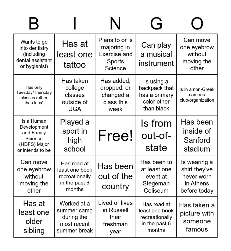 This bingo card has a free space and 360 words: Worked at a summer camp during the most recent summer break, Went to all the football home games during the last fall semester, Wants to go into dentistry (including dental assistant or hygienist), Uses a non-Mac laptop, Took the bus to campus this morning, Stayed in Athens during the most recent spring break or Thanksgiving break, Plans to or is majoring in Exercise and Sports Science, Pays for a music subscription service other than Spotify, Not planning to go into a healthcare profession, Lived or lives in Russell their freshman year, Lived or lives in Creswell their freshman year, Lived or lives in Brumby their freshman year, Is wearing a hat right now, Is on any of the UGA meal plans, Is left-handed, Is from out-of-state, Is fluent in a language other than English, Is a senior or super senior (4th year or beyond!), Has taken the MCAT, Has taken a ballroom dancing class, Has sung in a chorus or choir, Has read at least one book recreationally in the past 6 months, Has over 1000 followers on any social media platform, Has only Tuesday/Thursday classes (other than labs), Has lived in Georgia their whole life, Has had to write a paper in-class in college, Has ever done an eating challenge at a restaurant, Has been to The Niche dining hall, Has been to both record stores in downtown Athens, Has been to at least one heavy metal concert, Has been to at least one event at Stegeman Coliseum, Has at least 2 roommates, Has a Ramsey membership, Did not go to any football home games during the last fall semester, Can wiggle their ears, Can play a musical instrument, Can do a cartwheel (don’t do one right now please), Beat at least one video game in the past 6 months, Has a family member who went or goes to UGA, Has taken college classes outside of UGA, Was in band or orchestra in high school, Went to a post-season football game during the most recent season, Took or is taking BIOL 1103, 1104, 1107 and/or 1108 at UGA, Has an 8am class on Monday, Wednesday, and/or Friday, Is in a sorority or fraternity, Is not in a sorority or fraternity, Has a dog (at home or in Athens), Already knew at least one student in this class before today, Is a Human Development and Family Science (HDFS) Major or intends to be, Has been out of the country, Has ridden an Athens city bus, is living in a dorm this school year, Got a haircut in the last 7 days, Is wearing a shirt they've never worn in Athens before today, Moved (back) to Athens on a day other than August 8th or 9th, Played a sport in high school, Has been in a play or any other kind of theatrical production, Had a high school graduating class size of 200 students or fewer, Is using a backpack that has a primary color other than black, Ran/jogged at least 1 mile in the past 7 days, Walked to at least one of the buildings they have class in before yesterday, Has or had a job on campus, Has taken a picture with someone famous, Had breakfast before they got to class this morning, Knows the name of a professor for one of the non-A&P classes they're taking, Doesn't regularly drink coffee, Has listened to a full album within the past month, Has ever bought music on CD, vinyl, or cassette, Has bought something other than a book at the UGA bookstore, Has purchased a video game that they still haven't played yet, Has earphones on their person or in their bag right now, Has at least one tattoo, Has added, dropped, or changed a class this week, Lives off campus, Has a water bottle with them right now, Flossed their teeth at some point in the last 48 hours, Has at least one older sibling, Has at least one younger sibling, Has at least one physical book in their bag right now, Has at least one pen or pencil with them that is not blue or black, Purchased something in downtown Athens since the start of the month, Has been inside of Sanford stadium, Is wearing UGA-branded clothing or apparel of any kind, Has at least one food allergy, Is in a non-Greek campus club/organization, Has a class immediately after this one, Has ridden a bike some time in the last year, Has already done the get-to-know-you assignment on eLC (THANK YOU!), Can move one eyebrow without moving the other, Has ever taken a summer class, Worked at a summer camp during the most recent summer break, Went to all the football home games during the last fall semester, Wants to go into dentistry (including dental assistant or hygienist), Uses a non-Mac laptop, Took the bus to campus this morning, Stayed in Athens during the most recent spring break or Thanksgiving break, Plans to or is majoring in Exercise and Sports Science, Pays for a music subscription service other than Spotify, Not planning to go into a healthcare profession, Lived or lives in Russell their freshman year, Lived or lives in Creswell their freshman year, Lived or lives in Brumby their freshman year, Is wearing a hat right now, Is on any of the UGA meal plans, Is left-handed, Is from out-of-state, Is fluent in a language other than English, Is a senior or super senior (4th year or beyond!), Has taken the MCAT, Has taken a ballroom dancing class, Has sung in a chorus or choir, Has read at least one book recreationally in the past 6 months, Has over 1000 followers on any social media platform, Has only Tuesday/Thursday classes (other than labs), Has lived in Georgia their whole life, Has had to write a paper in-class in college, Has ever done an eating challenge at a restaurant, Has been to The Niche dining hall, Has been to both record stores in downtown Athens, Has been to at least one heavy metal concert, Has been to at least one event at Stegeman Coliseum, Has at least 2 roommates, Has a Ramsey membership, Did not go to any football home games during the last fall semester, Can wiggle their ears, Can play a musical instrument, Can do a cartwheel (don’t do one right now please), Beat at least one video game in the past 6 months, Has a family member who went or goes to UGA, Has taken college 