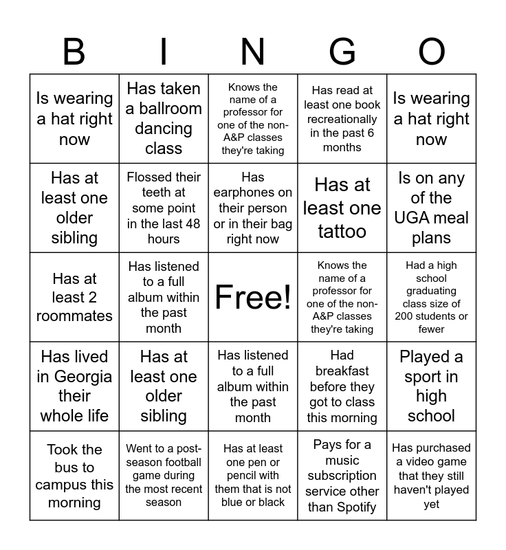 ⚠ This card has duplicate items: Worked at a summer camp during the most recent summer break (5), Went to all the football home games during the last fall semester (5), Wants to go into dentistry (including dental assistant or hygienist) (5), Uses a non-Mac laptop (5), Took the bus to campus this morning (5), Stayed in Athens during the most recent spring break or Thanksgiving break (5), Plans to or is majoring in Exercise and Sports Science (5), Pays for a music subscription service other than Spotify (5), Not planning to go into a healthcare profession (5), Lived or lives in Russell their freshman year (5), Lived or lives in Creswell their freshman year (5), Lived or lives in Brumby their freshman year (5), Is wearing a hat right now (5), Is on any of the UGA meal plans (5), Is left-handed (5), Is from out-of-state (5), Is fluent in a language other than English (5), Is a senior or super senior (4th year or beyond!) (5), Has taken the MCAT (5), Has taken a ballroom dancing class (5), Has sung in a chorus or choir (5), Has read at least one book recreationally in the past 6 months (5), Has over 1000 followers on any social media platform (5), Has only Tuesday/Thursday classes (other than labs) (5), Has lived in Georgia their whole life (5), Has had to write a paper in-class in college (5), Has ever done an eating challenge at a restaurant (5), Has been to The Niche dining hall (5), Has been to both record stores in downtown Athens (5), Has been to at least one heavy metal concert (5), Has been to at least one event at Stegeman Coliseum (4), Has at least 2 roommates (4), Has a Ramsey membership (4), Did not go to any football home games during the last fall semester (4), Can wiggle their ears (4), Can play a musical instrument (4), Can do a cartwheel (don’t do one right now please) (4), Beat at least one video game in the past 6 months (4), Has a family member who went or goes to UGA (4), Has taken college classes outside of UGA (4), Was in band or orchestra in high school (4), Went to a post-season football game during the most recent season (4), Took or is taking BIOL 1103, 1104, 1107 and/or 1108 at UGA (4), Has an 8am class on Monday, Wednesday, and/or Friday (4), Is in a sorority or fraternity (4), Is not in a sorority or fraternity (4), Has a dog (at home or in Athens) (4), Already knew at least one student in this class before today (4), Is a Human Development and Family Science (HDFS) Major or intends to be (4), Has been out of the country (4), Has ridden an Athens city bus (4), is living in a dorm this school year (4), Got a haircut in the last 7 days (4), Is wearing a shirt they've never worn in Athens before today (4), Moved (back) to Athens on a day other than August 8th or 9th (4), Played a sport in high school (4), Has been in a play or any other kind of theatrical production (4), Had a high school graduating class size of 200 students or fewer (4), Is using a backpack that has a primary color other than black (4), Ran/jogged at least 1 mile in the past 7 days (4), Walked to at least one of the buildings they have class in before yesterday (4), Has or had a job on campus (4), Has taken a picture with someone famous (4), Had breakfast before they got to class this morning (4), Knows the name of a professor for one of the non-A&P classes they're taking (4), Doesn't regularly drink coffee (4), Has listened to a full album within the past month (4), Has ever bought music on CD, vinyl, or cassette (4), Has bought something other than a book at the UGA bookstore (4), Has purchased a video game that they still haven't played yet (4), Has earphones on their person or in their bag right now (4), Has at least one tattoo (4), Has added, dropped, or changed a class this week (4), Lives off campus (4), Has a water bottle with them right now (4), Flossed their teeth at some point in the last 48 hours (4), Has at least one older sibling (4), Has at least one younger sibling (4), Has at least one physical book in their bag right now (4), Has at least one pen or pencil with them that is not blue or black (4), Purchased something in downtown Athens since the start of the month (4), Has been inside of Sanford stadium (4), Is wearing UGA-branded clothing or apparel of any kind (4), Has at least one food allergy (4), Is in a non-Greek campus club/organization (4), Has a class immediately after this one (4), Has ridden a bike some time in the last year (4), Has already done the get-to-know-you assignment on eLC (THANK YOU!) (4), Can move one eyebrow without moving the other (4), Has ever taken a summer class (3)