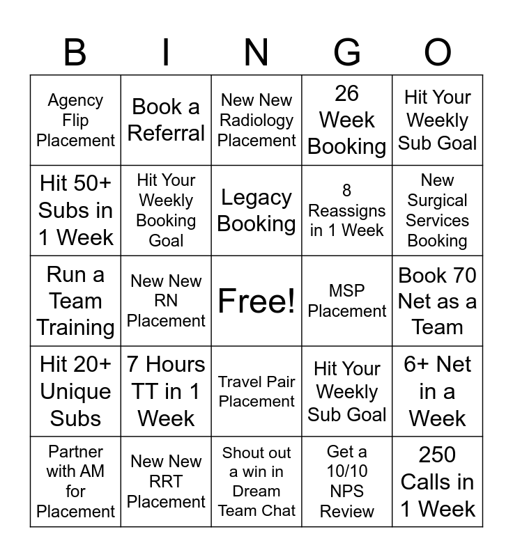 This bingo card has a free space and 24 words: 7 Hours TT in 1 Week, New New RRT Placement, Legacy Booking, Partner with AM for Placement, Hit Your Weekly Sub Goal, Agency Flip Placement, Hit 50+ Subs in 1 Week, Book a Referral, MSP Placement, Travel Pair Placement, 8 Reassigns in 1 Week, Run a Team Training, Hit Your Weekly Sub Goal, 6+ Net in a Week, Hit Your Weekly Booking Goal, Get a 10/10 NPS Review, Book 70 Net as a Team, New New Radiology Placement, New Surgical Services Booking, New New RN Placement, 250 Calls in 1 Week, Hit 20+ Unique Subs, 26 Week Booking and Shout out a win in Dream Team Chat.