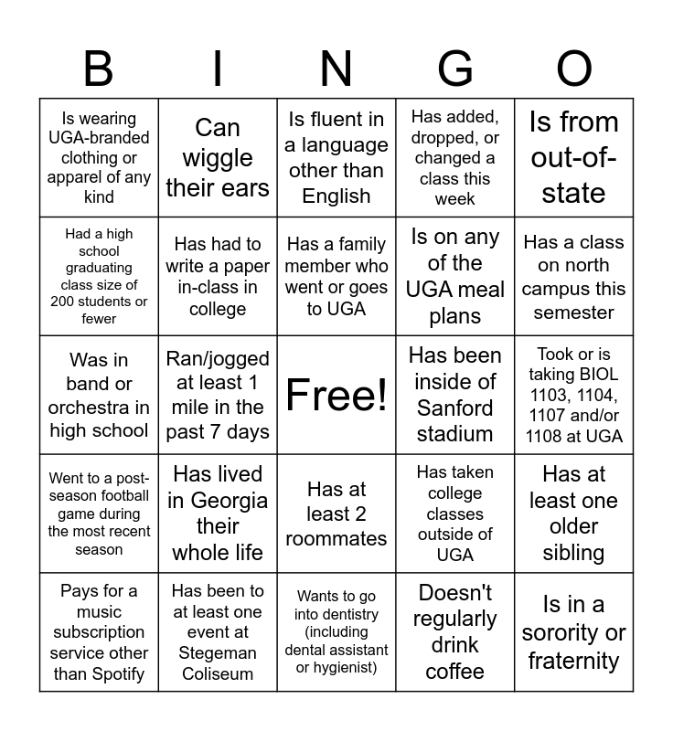This bingo card has a free space and 92 words: Worked at a summer camp during the most recent summer break, Went to all the football home games during the last fall semester, Wants to go into dentistry (including dental assistant or hygienist), Uses a non-Mac laptop, Took the bus to campus this morning, Stayed in Athens during the most recent spring break or Thanksgiving break, Plans to or is majoring in Exercise and Sports Science, Pays for a music subscription service other than Spotify, Not planning to go into a healthcare profession, Lived or lives in Russell their freshman year, Lived or lives in Creswell their freshman year, Lived or lives in Brumby their freshman year, Is wearing a hat right now, Is on any of the UGA meal plans, Is left-handed, Is from out-of-state, Is fluent in a language other than English, Is a senior or super senior (4th year or beyond!), Has taken the MCAT, Has taken a ballroom dancing class, Has sung in a chorus or choir, Has read at least one book recreationally in the past 6 months, Has over 1000 followers on any social media platform, Has only Tuesday/Thursday classes (other than labs), Has lived in Georgia their whole life, Has had to write a paper in-class in college, Has ever done an eating challenge at a restaurant, Has been to The Niche dining hall, Has been to both record stores in downtown Athens, Has been to at least one heavy metal concert, Has been to at least one event at Stegeman Coliseum, Has at least 2 roommates, Has a Ramsey membership, Did not go to any football home games during the last fall semester, Can wiggle their ears, Can play a musical instrument, Can do a cartwheel (don’t do one right now please), Beat at least one video game in the past 6 months, Has a family member who went or goes to UGA, Has taken college classes outside of UGA, Was in band or orchestra in high school, Went to a post-season football game during the most recent season, Took or is taking BIOL 1103, 1104, 1107 and/or 1108 at UGA, Has an 8am class on Monday, Wednesday, and/or Friday, Is in a sorority or fraternity, Is not in a sorority or fraternity, Has a dog (at home or in Athens), Already knew at least one student in this class before today, Is a Human Development and Family Science (HDFS) Major or intends to be, Has been out of the country, Has ridden an Athens city bus, is living in a dorm this school year, Got a haircut in the last 7 days, Is wearing a shirt they've never worn in Athens before today, Moved (back) to Athens on a day other than August 8th or 9th, Played a sport in high school, Has been in a play or any other kind of theatrical production, Had a high school graduating class size of 200 students or fewer, Is using a backpack that has a primary color other than black, Ran/jogged at least 1 mile in the past 7 days, Walked to at least one of the buildings they have class in before yesterday, Has or had a job on campus, Has taken a picture with someone famous, Had breakfast before they got to class this morning, Knows the name of a professor for one of the non-A&P classes they're taking, Doesn't regularly drink coffee, Has listened to a full album within the past month, Has ever bought music on CD, vinyl, or cassette, Has bought something other than a book at the UGA bookstore, Has purchased a video game that they still haven't played yet, Has earphones on their person or in their bag right now, Has at least one tattoo, Has added, dropped, or changed a class this week, Lives off campus, Has a water bottle with them right now, Flossed their teeth at some point in the last 48 hours, Has at least one older sibling, Has at least one younger sibling, Has at least one physical book in their bag right now, Has at least one pen or pencil with them that is not blue or black, Purchased something in downtown Athens since the start of the month, Has been inside of Sanford stadium, Is wearing UGA-branded clothing or apparel of any kind, Has at least one food allergy, Is in a non-Greek campus club/organization, Has a class immediately after this one, Has ridden a bike some time in the last year, Has already done the get-to-know-you assignment on eLC (THANK YOU!), Can move one eyebrow without moving the other, Has ever taken a summer class, Has a class on north campus this semester and Has a class that ends after 5pm this semester.