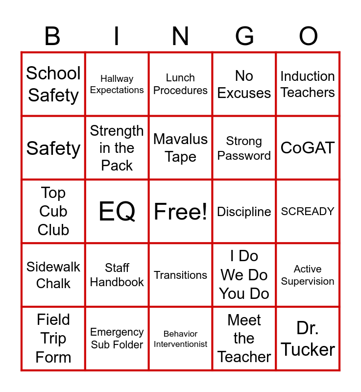 This bingo card has a free space and 61 words: Arrival/Dismissal, Emergency Sub Folder, Parent Communication, Sidewalk Chalk, Meet the Teacher, Bulletin Board, Strength in the Pack, Command Strips, Strong Password, Positive Referrals, No Excuses, Magnet Program, Safety, Store-Bought Treats, Split Rosters, School Safety, Dr. Tucker, Induction Teachers, Instructional Guidance, Mavalus Tape, Discipline, Lunch Procedures, Field Trip Form, Active Supervision, STEM Coach, New Bus Info, Mrs. Coan, IEP, CoGAT, Morning Duty, Truancy, First Friday, Laptop, Bulletin Board, Hallway Expectations, Reinforcement, Parent Portal, EQ, Supply Closet, Top Cub Club, MTSS, Staff Handbook, SCREADY, Tech Ticket, I Do We Do You Do, Charger Fee, Field Trip Form, Counselor, Lesson Plans, Transitions, Behavior Interventionist, Chat and Chew, Instructional Guidance, 504 Plans, Strength in the Pack, Aesop, Top Cub Club Cart, Professional Development, Wellford Family, Weekly Updates and Active Supervision.