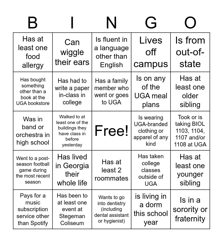 This bingo card has a free space and 93 words: Worked at a summer camp during the most recent summer break, Went to all the football home games during the last fall semester, Wants to go into dentistry (including dental assistant or hygienist), Uses a non-Mac laptop, Took the bus to campus this morning, Stayed in Athens during the most recent spring break or Thanksgiving break, Plans to or is majoring in Exercise and Sports Science, Pays for a music subscription service other than Spotify, Not planning to go into a healthcare profession, Lived or lives in Russell their freshman year, Lived or lives in Creswell their freshman year, Lived or lives in Brumby their freshman year, Is wearing a hat right now, Is on any of the UGA meal plans, Is left-handed, Is from out-of-state, Is fluent in a language other than English, Is a senior or super senior (4th year or beyond!), Has taken the MCAT, Has taken a ballroom dancing class, Has sung in a chorus or choir, Has read at least one book recreationally in the past 6 months, Has over 1000 followers on any social media platform, Has only Tuesday/Thursday classes (other than labs), Has lived in Georgia their whole life, Has had to write a paper in-class in college, Has ever done an eating challenge at a restaurant, Has been to The Niche dining hall, Has been to both record stores in downtown Athens, Has been to at least one heavy metal concert, Has been to at least one event at Stegeman Coliseum, Has at least 2 roommates, Has a Ramsey membership, Did not go to any football home games during the last fall semester, Can wiggle their ears, Can play a musical instrument, Can do a cartwheel (don’t do one right now please), Beat at least one video game in the past 6 months, Has a family member who went or goes to UGA, Has taken college classes outside of UGA, Was in band or orchestra in high school, Went to a post-season football game during the most recent season, Took or is taking BIOL 1103, 1104, 1107 and/or 1108 at UGA, Has an 8am class on Monday, Wednesday, and/or Friday, Is in a sorority or fraternity, Is not in a sorority or fraternity, Has a dog (at home or in Athens), Already knew at least one student in this class before today, Is a Human Development and Family Science (HDFS) Major or intends to be, Has been out of the country, Has ridden an Athens city bus, is living in a dorm this school year, Got a haircut in the last 7 days, Is wearing a shirt they've never worn in Athens before today, Moved (back) to Athens on a day other than August 8th or 9th, Played a sport in high school, Has been in a play or any other kind of theatrical production, Had a high school graduating class size of 200 students or fewer, Is using a backpack that has a primary color other than black, Ran/jogged at least 1 mile in the past 7 days, Walked to at least one of the buildings they have class in before yesterday, Has or had a job on campus, Has taken a picture with someone famous, Had breakfast before they got to class this morning, Knows the name of a professor for one of the non-A&P classes they're taking, Doesn't regularly drink coffee, Has listened to a full album within the past month, Has ever bought music on CD, vinyl, or cassette, Has bought something other than a book at the UGA bookstore, Has purchased a video game that they still haven't played yet, Has earphones on their person or in their bag right now, Has at least one tattoo, Has added, dropped, or changed a class this week, Lives off campus, Has a water bottle with them right now, Flossed their teeth at some point in the last 48 hours, Has at least one older sibling, Has at least one younger sibling, Has at least one physical book in their bag right now, Has at least one pen or pencil with them that is not blue or black, Purchased something in downtown Athens since the start of the month, Has been inside of Sanford stadium, Is wearing UGA-branded clothing or apparel of any kind, Has at least one food allergy, Is in a non-Greek campus club/organization, Has a class immediately after this one, Has ridden a bike some time in the last year, Has already done the get-to-know-you assignment on eLC (THANK YOU!), Can move one eyebrow without moving the other, Has ever taken a summer class, Has a class on north campus this semester, Has a class that ends after 5pm this semester and Uses something other than Chrome or Safari as their internet browser.