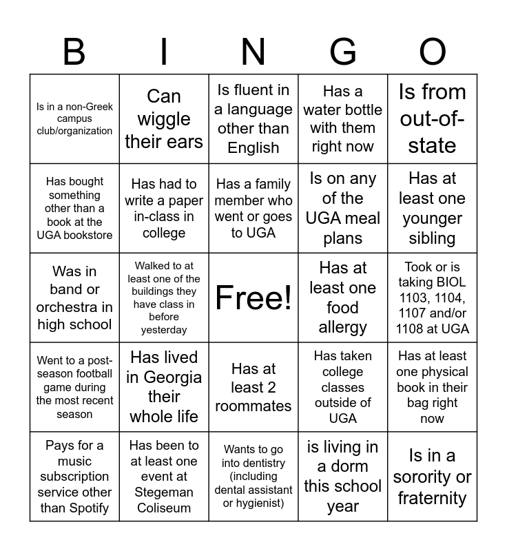 This bingo card has a free space and 94 words: Worked at a summer camp during the most recent summer break, Went to all the football home games during the last fall semester, Wants to go into dentistry (including dental assistant or hygienist), Uses a non-Mac laptop, Took the bus to campus this morning, Stayed in Athens during the most recent spring break or Thanksgiving break, Plans to or is majoring in Exercise and Sports Science, Pays for a music subscription service other than Spotify, Not planning to go into a healthcare profession, Lived or lives in Russell their freshman year, Lived or lives in Creswell their freshman year, Lived or lives in Brumby their freshman year, Is wearing a hat right now, Is on any of the UGA meal plans, Is left-handed, Is from out-of-state, Is fluent in a language other than English, Is a senior or super senior (4th year or beyond!), Has taken the MCAT, Has taken a ballroom dancing class, Has sung in a chorus or choir, Has read at least one book recreationally in the past 6 months, Has over 1000 followers on any social media platform, Has only Tuesday/Thursday classes (other than labs), Has lived in Georgia their whole life, Has had to write a paper in-class in college, Has ever done an eating challenge at a restaurant, Has been to The Niche dining hall, Has been to both record stores in downtown Athens, Has been to at least one heavy metal concert, Has been to at least one event at Stegeman Coliseum, Has at least 2 roommates, Has a Ramsey membership, Did not go to any football home games during the last fall semester, Can wiggle their ears, Can play a musical instrument, Can do a cartwheel (don’t do one right now please), Beat at least one video game in the past 6 months, Has a family member who went or goes to UGA, Has taken college classes outside of UGA, Was in band or orchestra in high school, Went to a post-season football game during the most recent season, Took or is taking BIOL 1103, 1104, 1107 and/or 1108 at UGA, Has an 8am class on Monday, Wednesday, and/or Friday, Is in a sorority or fraternity, Is not in a sorority or fraternity, Has a dog (at home or in Athens), Already knew at least one student in this class before today, Is a Human Development and Family Science (HDFS) Major or intends to be, Has been out of the country, Has ridden an Athens city bus, is living in a dorm this school year, Got a haircut in the last 7 days, Is wearing a shirt they've never worn in Athens before today, Moved (back) to Athens on a day other than August 8th or 9th, Played a sport in high school, Has been in a play or any other kind of theatrical production, Had a high school graduating class size of 200 students or fewer, Is using a backpack that has a primary color other than black, Ran/jogged at least 1 mile in the past 7 days, Walked to at least one of the buildings they have class in before yesterday, Has or had a job on campus, Has taken a picture with someone famous, Had breakfast before they got to class this morning, Knows the name of a professor for one of the non-A&P classes they're taking, Doesn't regularly drink coffee, Has listened to a full album within the past month, Has ever bought music on CD, vinyl, or cassette, Has bought something other than a book at the UGA bookstore, Has purchased a video game that they still haven't played yet, Has earphones on their person or in their bag right now, Has at least one tattoo, Has added, dropped, or changed a class this week, Lives off campus, Has a water bottle with them right now, Flossed their teeth at some point in the last 48 hours, Has at least one older sibling, Has at least one younger sibling, Has at least one physical book in their bag right now, Has at least one pen or pencil with them that is not blue or black, Purchased something in downtown Athens since the start of the month, Has been inside of Sanford stadium, Is wearing UGA-branded clothing or apparel of any kind, Has at least one food allergy, Is in a non-Greek campus club/organization, Has a class immediately after this one, Has ridden a bike some time in the last year, Has already done the get-to-know-you assignment on eLC (THANK YOU!), Can move one eyebrow without moving the other, Has ever taken a summer class, Has a class on north campus this semester, Has a class that ends after 5pm this semester, Uses something other than Chrome or Safari as their internet browser and Has purchased a film/show on some type of physical media in the past year.