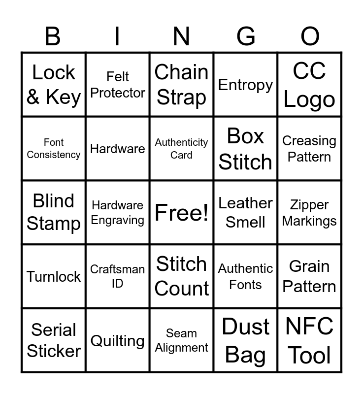 This bingo card has a free space and 40 words: Serial Number, Blind Stamp, Date code, Hardware, Quilting, Stitch Count, Authenticity Card, Microchip, CC Logo, Turnlock, Hardware Engraving, Entropy, NFC Tool, Zipper Markings, Leather Smell, Craftsman ID, H Logo, Lock & Key, Hologram Logo, Chain Strap, Grain Pattern, Dust Bag, Box Stitch, Font Consistency, Symmetry, Made in Stamp, Lining Material, Edge Paint, Glazing, Stitch Direction, Flap Shape, Serial Sticker, Screw Type, Authentic Fonts, Creasing Pattern, Seam Alignment, Contrast Stitching, Brand Stamp, Felt Protector and Interior Stamp.