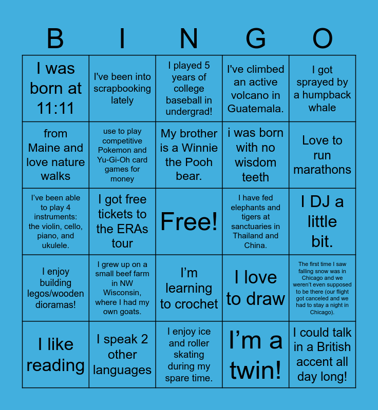 This bingo card has a free space and 99 words: I have a second degree black belt in taekwondo!, I like to bake & decorate, I got to hike the Dolomites in Italy!, I played 5 years of college baseball in undergrad!, I am able to crochet!, I went to Japan and Vietnam this summer, I’ve visited Singapore 3 times!, I run marathons, I ran the rock climbing club but was horrible at rock climbing, I’ve been to more countries than states, I studied abroad in South Korea for a summer, I absolutely love backpacking!, I’ve been dancing ballet since I was 3 years old!, I’m learning to crochet, I enjoy painting, I was born at 11:11, I've been into scrapbooking lately, Fun fact about me is that I’ve never broken a bone before., I can do the worm!, i love to read, I love to rock climb!!, love to travel but haven’t left the states, I love to run, I love to read, I like to go to art museums, The first time I saw falling snow was in Chicago and we weren’t even supposed to be there (our flight got canceled and we had to stay a night in Chicago)., My brother is a Winnie the Pooh bear., A fun fact about me is like to play violin and guitar., I've been scuba diving in Hawaii!, I enjoy dancing, I enjoy ice and roller skating during my spare time., I’m a twin!, My first language was Spanish!, I am such a foodie, and I love making fusion foods, I got free tickets to the ERAs tour, I’ve been able to play 4 instruments: the violin, cello, piano, and ukulele., I have a sandwich named after me at my undergrad, I love reading and movies, I’m trilingual, I grew up on a small beef farm in NW Wisconsin, where I had my own goats., I am a triplet, Love to run marathons, I've climbed an active volcano in Guatemala., I speak 2 other languages, i am a photographer, I majored in Statistics, I won a Blackjack tournament, When I was 19, I actually got to work in Washington D.C. for the JROTC Leadership and Academic Bowl and I was on the public speaking team, so I did everything from tweaking scripts, hosting opening/awards ceremonies, hanging signs, and even send, My name backwards is teenrap, I enjoy cooking and baking, I’ve competed twice in the same a capella singing competition as showcased in the movie, Pitch Perfect., I have shaved my head before., I could talk in a British accent all day long!, I love to draw, All my dogs have been named after sunglasses, I love to draw, listen to music, and go for short walks., I used to play rugby., I had a corneal transplant at 6 years old, I can play 6 instruments and I’ve visited every Disneyland park in the world, I'm Lebanese, I was born and raised in Lebanon then moved to the U.S. when I was 16, so I’ve had the chance to experience life in two very different places. I’m trilingual: Arabic is my first language, then French, and finally English., I’ve been playing guitar for about 15 years, I have read over 500 books! Reading is my favorite hobby., I play the cello (not the most active, but still play it once in a while)., I can solve a rubik's cube in under 2 minutes., I love to bike., I studied abroad in Chile!, I got sprayed by a humpback whale, A troop of chimpanzees almost killed me in Uganda once!, I love photography, I have a fishing world record!, I enjoy building legos/wooden dioramas!, I enjoy cooking and going on walks, i was born with no wisdom teeth, from Maine and love nature walks, I am really good at reading messy handwriting and I am a huge basketball fan, I ran my university's basketball league for four years and loved managing every part of it., I love to rock climb (indoors AND outdoors!), I love beach volleyball, use to play competitive Pokemon and Yu-Gi-Oh card games for money, I just went to Yellowstone, I’ve lived in three different states, three different countries and I’m allergic to pitted fruits, I recently hiked the Grand Canyon rim to river to rim., I have fed elephants and tigers at sanctuaries in Thailand and China., I love figure skating. I'm currently on my gold level ice dances! I joined summer orchestra and we performed at our concert just last week. I sometimes raise monarch butterflies over the summer with my mom. Lastly, I got to travel a bit in 2025 i, This will be my first time living independently!, I had a pet sheep when I was little., I’ve been a vegetarian since I was 6 years old (by choice) which is why I developed a passion for cooking for myself and others!, I’m trying to visit all 50 states before I turn 50. So far 38/50, I am down for just about anything, A fun fact about myself is that I love to play soccer., I DJ a little bit., I like reading, Visited 5 countries this past summer, I make music, I really like animals and plants, I use to cheer in high school so I can do a back flip!, I use to cheer in high school so I can do a back flip!, I like to dance, my ethnicity & nationality is kind of confusing!, I love to read and hadn’t been to Chicago until my interview and I hiked to a green sand beach this summer (there are only 4 in the world).