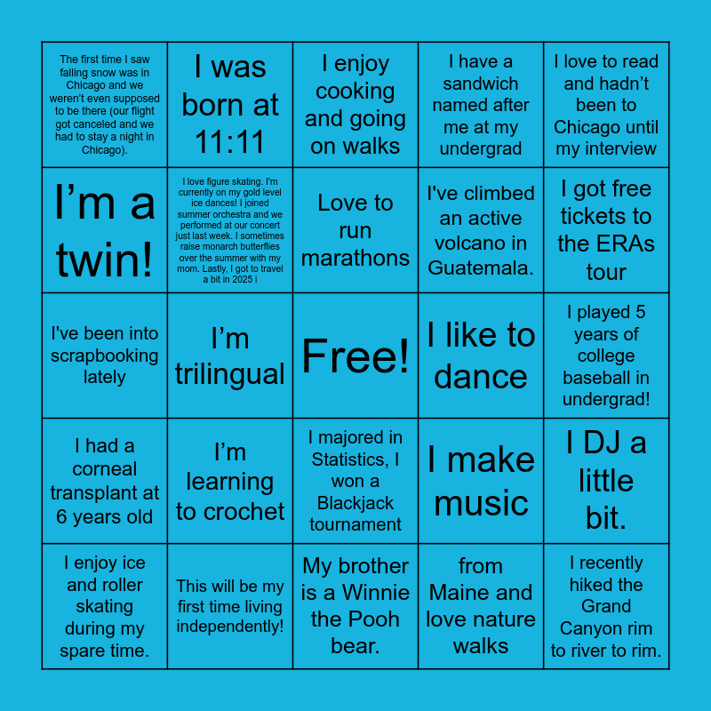 This bingo card has a free space and 98 words: I have a second degree black belt in taekwondo!, I like to bake & decorate, I got to hike the Dolomites in Italy!, I played 5 years of college baseball in undergrad!, I am able to crochet!, I went to Japan and Vietnam this summer, I’ve visited Singapore 3 times!, I run marathons, I ran the rock climbing club but was horrible at rock climbing, I’ve been to more countries than states, I studied abroad in South Korea for a summer, I absolutely love backpacking!, I’ve been dancing ballet since I was 3 years old!, I’m learning to crochet, I enjoy painting, I was born at 11:11, I've been into scrapbooking lately, Fun fact about me is that I’ve never broken a bone before., I can do the worm!, i love to read, I love to rock climb!!, love to travel but haven’t left the states, I love to run, I love to read, I like to go to art museums, The first time I saw falling snow was in Chicago and we weren’t even supposed to be there (our flight got canceled and we had to stay a night in Chicago)., My brother is a Winnie the Pooh bear., A fun fact about me is like to play violin and guitar., I've been scuba diving in Hawaii!, I enjoy dancing, I enjoy ice and roller skating during my spare time., I’m a twin!, My first language was Spanish!, I am such a foodie, and I love making fusion foods, I got free tickets to the ERAs tour, I’ve been able to play 4 instruments: the violin, cello, piano, and ukulele., I have a sandwich named after me at my undergrad, I love reading and movies, I’m trilingual, I grew up on a small beef farm in NW Wisconsin, where I had my own goats., I am a triplet, Love to run marathons, I've climbed an active volcano in Guatemala., I speak 2 other languages, i am a photographer, I majored in Statistics, I won a Blackjack tournament, When I was 19, I actually got to work in Washington D.C. for the JROTC Leadership and Academic Bowl and I was on the public speaking team, so I did everything from tweaking scripts, hosting opening/awards ceremonies, hanging signs, and even send, My name backwards is teenrap, I enjoy cooking and baking, I’ve competed twice in the same a capella singing competition as showcased in the movie, Pitch Perfect., I have shaved my head before., I could talk in a British accent all day long!, I love to draw, All my dogs have been named after sunglasses, I love to draw, listen to music, and go for short walks., I used to play rugby., I had a corneal transplant at 6 years old, I can play 6 instruments and I’ve visited every Disneyland park in the world, I'm Lebanese, I was born and raised in Lebanon then moved to the U.S. when I was 16, so I’ve had the chance to experience life in two very different places. I’m trilingual: Arabic is my first language, then French, and finally English., I’ve been playing guitar for about 15 years, I have read over 500 books! Reading is my favorite hobby., I play the cello (not the most active, but still play it once in a while)., I can solve a rubik's cube in under 2 minutes., I love to bike., I studied abroad in Chile!, I got sprayed by a humpback whale, A troop of chimpanzees almost killed me in Uganda once!, I love photography, I have a fishing world record!, I enjoy building legos/wooden dioramas!, I enjoy cooking and going on walks, i was born with no wisdom teeth, from Maine and love nature walks, I am really good at reading messy handwriting and I am a huge basketball fan, I ran my university's basketball league for four years and loved managing every part of it., I love to rock climb (indoors AND outdoors!), I love beach volleyball, use to play competitive Pokemon and Yu-Gi-Oh card games for money, I just went to Yellowstone, I’ve lived in three different states, three different countries and I’m allergic to pitted fruits, I recently hiked the Grand Canyon rim to river to rim., I have fed elephants and tigers at sanctuaries in Thailand and China., I love figure skating. I'm currently on my gold level ice dances! I joined summer orchestra and we performed at our concert just last week. I sometimes raise monarch butterflies over the summer with my mom. Lastly, I got to travel a bit in 2025 i, This will be my first time living independently!, I had a pet sheep when I was little., I’ve been a vegetarian since I was 6 years old (by choice) which is why I developed a passion for cooking for myself and others!, I’m trying to visit all 50 states before I turn 50. So far 38/50, I am down for just about anything, A fun fact about myself is that I love to play soccer., I DJ a little bit., I like reading, Visited 5 countries this past summer, I make music, I really like animals and plants, I use to cheer in high school so I can do a back flip!, I like to dance, my ethnicity & nationality is kind of confusing!, I love to read and hadn’t been to Chicago until my interview and I hiked to a green sand beach this summer (there are only 4 in the world).
