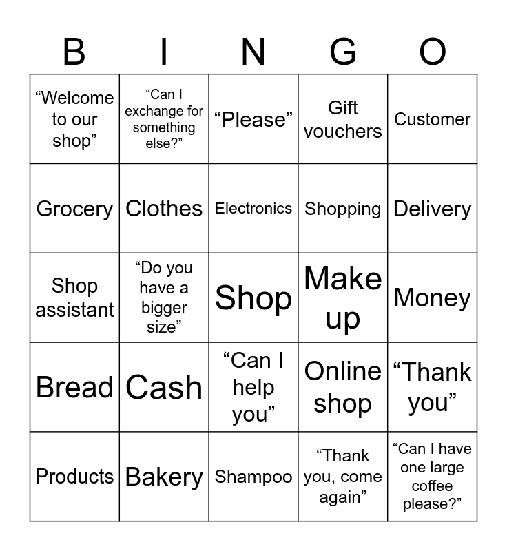 This bingo card has 40 words: Florist, Shop assistant, Fresh fruit, Clothes, Bakery, “Can I help you”, Electronics, Pharmacy, Customer, Bread, “Do you have a bigger size”, Gift vouchers, Shop, Money, Make up, Cash, Shopping list, “Welcome to our shop”, “How much is it”, “Please”, “Thank you”, “Thank you, come again”, Shopping, Grocery, Card, Supermarket, Butcher, Cafeteria, “Can I have one large coffee please?”, Department, Hair salon, Products, Boutique, Online shop, Delivery, Shampoo, Shopping mall, “I want a refund”, “Can I exchange for something else?” and “This item is damaged”.