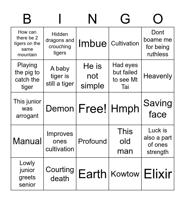 This bingo card has a free space and 24 words: Improves ones cultivation, Courting death, He is not simple, Lowly junior greets senior, Dont boame me for being ruthless, How can there be 2 tigers on the same mountain, Playing the pig to catch the tiger, Hidden dragons and crouching tigers, Hmph, Profound, Had eyes but failed to see Mt Tai, This junior was arrogant, This old man, Luck is also a part of ones strength, A baby tiger is still a tiger, Kowtow, Saving face, Imbue, Heavenly, Demon, Elixir, Manual, Cultivation and Earth.