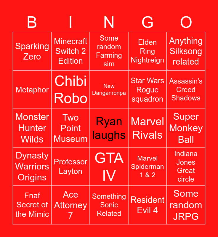 This bingo card has a free space and 24 words: Professor Layton, Ace Attorney 7, New Danganronpa, Fnaf Secret of the Mimic, Anything Silksong related, Sparking Zero, Metaphor, Minecraft Switch 2 Edition, Marvel Rivals, GTA IV, Star Wars Rogue squadron, Monster Hunter Wilds, Marvel Spiderman 1 & 2, Indiana Jones Great circle, Chibi Robo, Resident Evil 4, Super Monkey Ball, Some random Farming sim, Assassin's Creed Shadows, Two Point Museum, Some random JRPG, Dynasty Warriors Origins, Elden Ring Nightreign and Something Sonic Related.