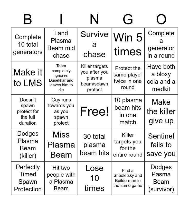 This bingo card has a free space and 24 words: Miss Plasma Beam, Hit two people with a Plasma Beam, Killer targets you after you plasma beam/spawn protect, Perfectly Timed Spawn Protection, Complete a generator in a round, Complete 10 total generators, Make it to LMS, Land Plasma Beam mid chase, 10 plasma beam hits in one match, 30 total plasma beam hits, Protect the same player twice in one round, Doesn't spawn protect for the full duration, Killer targets you for the entire round, Sentinel fails to save you, Team completely ignores Dusekkar and leaves him to die, Find a Shedletsky and Builderman in the same game, Make the killer give up, Survive a chase, Have both a bloxy cola and a medkit, Guy runs towards you as you spawn protect, Dodges Pasma Beam (survivor), Dodges Plasma Beam (killer), Win 5 times and Lose 10 times.
