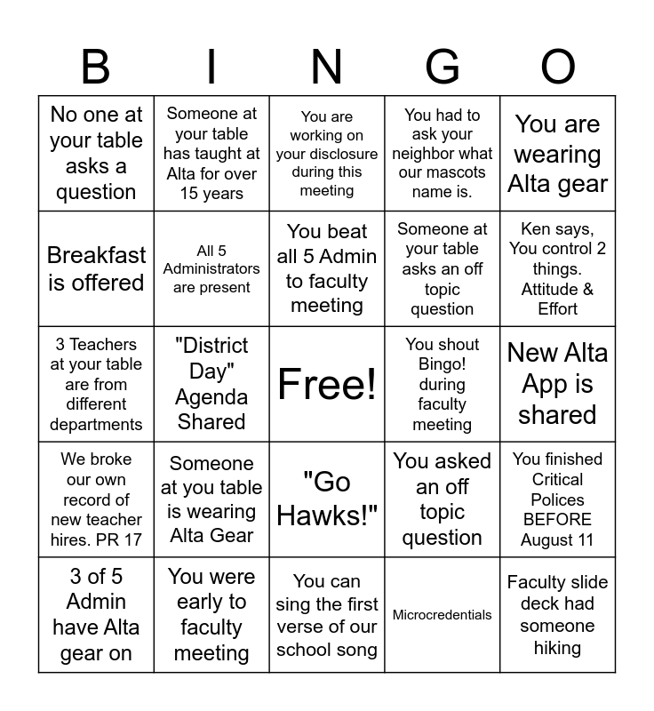 This bingo card has a free space and 24 words: Someone at you table is wearing Alta Gear, You were early to faculty meeting, You beat all 5 Admin to faculty meeting, 3 of 5 Admin have Alta gear on, You are wearing Alta gear, No one at your table asks a question, Breakfast is offered, Someone at your table has taught at Alta for over 15 years, You shout Bingo! during faculty meeting, "Go Hawks!", Someone at your table asks an off topic question, 3 Teachers at your table are from different departments, You asked an off topic question, You finished Critical Polices BEFORE August 11, All 5 Administrators are present, Microcredentials, New Alta App is shared, You are working on your disclosure during this meeting, Ken says, You control 2 things. Attitude & Effort, "District Day" Agenda Shared, Faculty slide deck had someone hiking, We broke our own record of new teacher hires. PR 17, You had to ask your neighbor what our mascots name is. and You can sing the first verse of our school song.